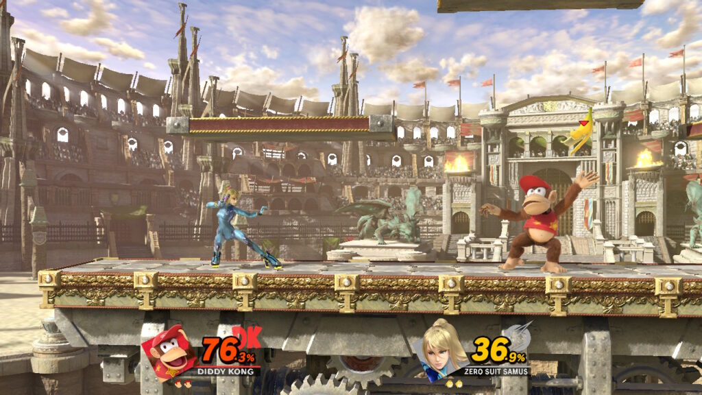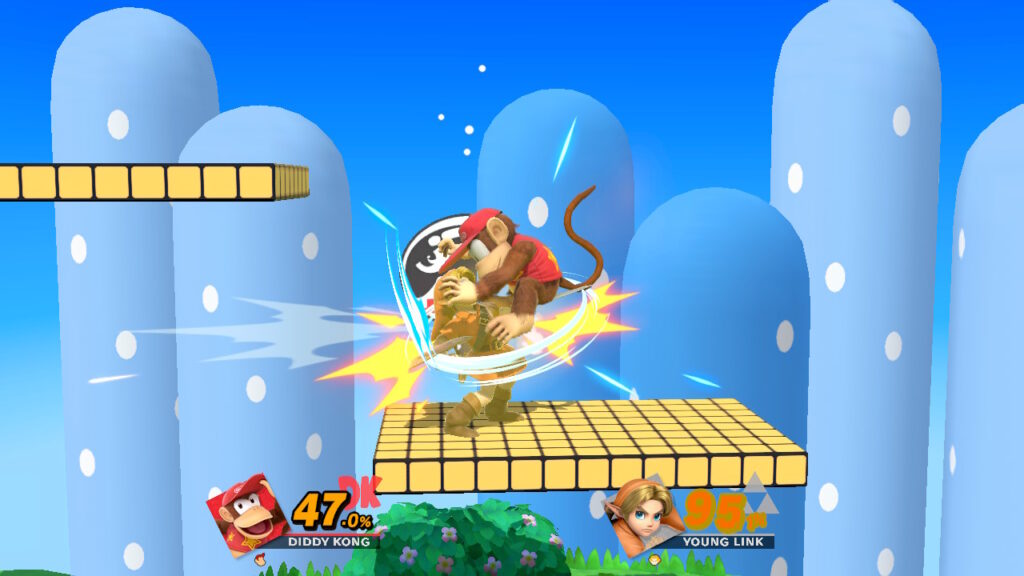 ディディーコングは、機動力・復帰力が高く、バナナ(下B)や崖上がり・着地(横B)が強いです。
